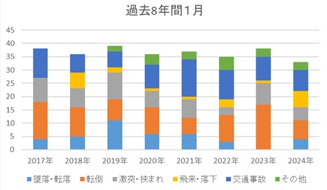 1月は、毎年滑って転びそうになった等の墜落・転落型、転倒型ヒヤリ・ハットが多く、原因は、滑った・躓いたです。